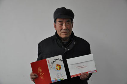 图为收到新年祝福的村民展示特制的城乡居民养老保险贺卡。