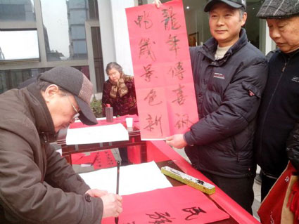 “龙年传喜讯,蛇岁景色新”、“盛世开新纪,小龙展壮猷”……很快,一副副飘着墨香的春联呈现在居民们面前,居民们接过后轻轻拿起,小心翼翼地拿到一旁晾干。在2个多小时的活动中,书法家和书画爱好者们共为社区居民书写了200多副春联,同时还绘就了多幅喜庆的年画。