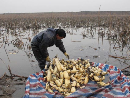 在孔集湾种养农民专业合作社基地里,记者看到,正有人穿着橡胶皮衣裤下到藕塘中采挖,手中还拿着高压水枪。此刻,藕塘中的水大多已被抽走,采藕人要用高压水枪冲走覆盖在莲藕上的泥,才能把莲藕从塘里拽出来。刚采挖出来的莲藕不但个头大,指甲一掐,还水嫩。询问缘由,除了藕的品种好,还有一个重要因素:不用化肥,完全施用农家肥。“用鸡屎粪,堆放发酵后,来年春天,埋到抽干水的塘泥里。肥力足,还是农家肥,莲藕就长得好。”孔集湾种养农民专业合作社理事长孔进向记者介绍说。