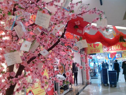 春节期间,商贸文化广场一家大型商业网点内,一家商店在店门前“栽”了一棵“许愿树”,满树正在绽放的“桃花”煞是好看,既带来了春的气息,也将环境映衬得格外清新,最重要的是,市民们可以在这棵树上许下自己的愿望。记者看到,“许愿树”上挂上了大量小卡片。