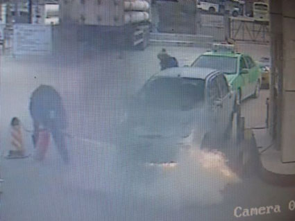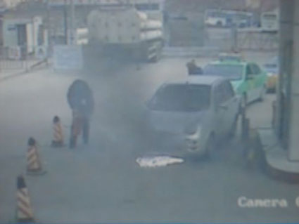 11点27分18秒:着火的小轿车前保险杠位置开始冒出了黑烟,黑烟迅速浓烈起来。这时,一直坐在驾驶室里的驾驶员打开车门,下车后立即跑开了。与此同时,加气站内的人群开始四散跑开。另一名加气员夏云大喊着疏散停在加气站里的车辆,大约七八辆等待着加气的车辆纷纷开始倒车,以最快的速度驶离加气站。