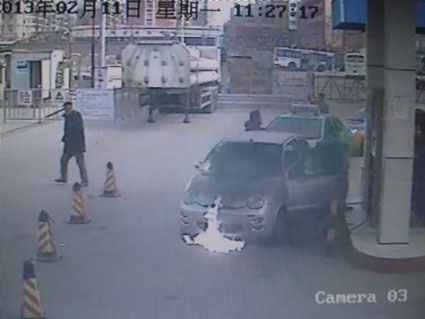 11点25分35秒:这辆小轿车加气结束。这名中年男子先后盖上了引擎盖和后备箱,重新坐回驾驶室,准备发动汽车。站在一旁的加气员宋欢发现,驾驶员在拧了三次钥匙,仍然没有将汽车引擎发动,驾驶员还在第四次重复着这样的动作。小轿车后面紧跟着的车辆已经离得很近,准备在这辆小轿车开走之后进行加气。