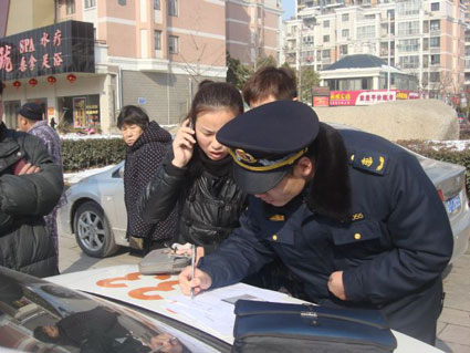 图二:一位涉嫌违规经营的出租车驾驶员正在接受路政执法人员的问询登记。