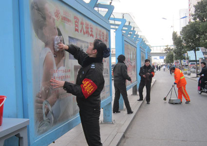 图:擦洗公交站牌,为市民营造干净的市容环境