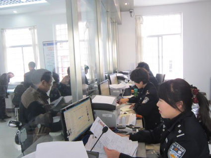 图为在市出入境管理局办证大厅,女警们正在为市民办理相关手续。