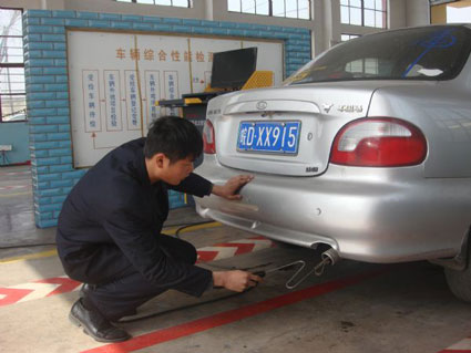 随后,记者亲自体验了整个检测过程。记者所要检测的车辆是一辆国产1.3升的小排量三厢轿车,入户时间是2009年4月21日,车辆已经行驶了8.5万公里,根据相关规定该车将在今年4月份进行第二次年审,在车辆进行安全系统年审前要先取得机动车环保检验合格标志。否则车辆不予年检。