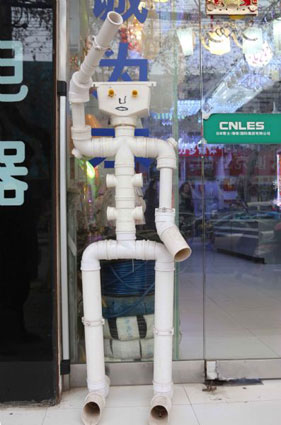 3月10日,记者在淮舜路旁一家五金店铺门前看到,该店铺利用市民平常所见的用于铺设下水管道的塑料管废料,做成一个高约1.5米的“机器人门童”,形神兼备地站在店面口,即节约环保又新颖别致,吸引了不少顾客的注意。