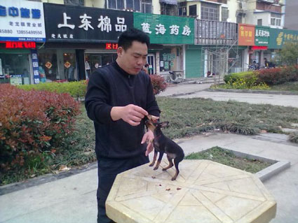 “嘿,大家看,这只小狗可真袖珍!”3月19日上午11时许,在洞山中路96菜市附近一张石桌上,樊先生正拿着几片树叶在逗他的爱犬玩。随着樊先生的手势变动,“袖珍犬”左右出击,将樊先生手里的树叶迅速咬下几片,它的机敏和小巧,一时间惹来路人围观。“这只小狗真可爱,恐怕至多3斤重吧?竟然看不见它的尾巴。”一位路人情不自禁地想伸手摸一摸。“这是杜宾犬,还小,才几个月大。”樊先生回答着。