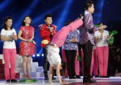 图:杨大妈展示绝技,拿“毕姥爷”的后背当墙倒立起来。(图片来自央视网)