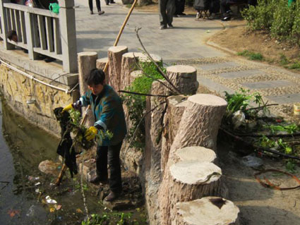 图二:保洁人员打捞塘中垃圾
