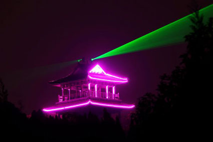 4月21日晚,家住洞山附近的市民可能会发现,舜耕山风景区的夜空又多了一份靓丽的色彩。当晚,记者发现位于淮河大道洞山隧道西侧山顶的清风阁突然亮了起来,粉色的LED灯勾勒出了清风阁的轮廓,绿色的镭射灯照亮了舜耕山风景区的夜空,引得不少市民驻足观看。