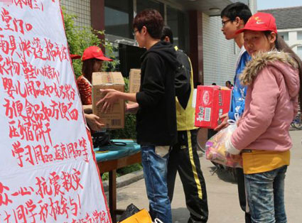 在刚刚过去的这个五一小长假,淮南师范学院生命科学系和化学与化工系的2000多名大学生自发为雅安灾区捐赠了急需的食品、药物、矿泉水、妇婴用品、衣服等共约600公斤的物品,并全部打包送往灾区。5月1日,参与组织捐赠活动的大学生蒋智智告诉记者,雅安地震发生后,网上发布了很多灾区急需物资的信息,他们依照这个信息在校园内组织了募捐活动,没想到同学们得知后踊跃捐物,甚至一些大学生还从生活费中挤出钱来,为灾区群众购买了急需物品,让人非常感动。