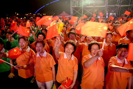 群众是当晚文艺汇演当之无愧的主角。当台上开始演唱《众人划桨开大船》时,整个广场沸腾了!台下的观众纷纷站起来,挥舞手中的荧光棒,全场一起唱,热情的群众、豪迈的歌声把广场变成了一个璀璨的大舞台!紧接着,在动感歌舞《high歌》中,现场群众自发跟着旋律摆起来。来自淮橡社区的潘翠香满脸喜悦,她高兴地说:“这样的文艺演出太欢乐了!很贴近生活,还特别热闹!我看的开心,唱的开心,跳的开心。”