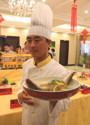 图为定远县池河镇当地厨师向游客展示梅白鱼菜品。