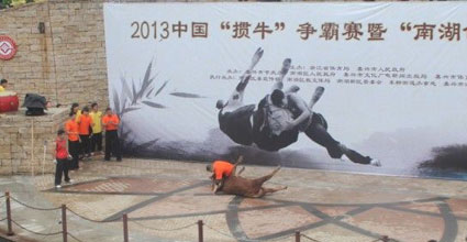 6月14日至16日,2013中国“掼牛”争霸赛在浙江省嘉兴南湖区中国斗牛馆举行。来自全国各地的12支代表队参加比赛。凤台县李冲回族乡源帆农业发展有限公司组织8名选手代表安徽队参加竞技并取得个人第二名和第六名的好成绩。