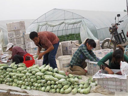 图为在潘集区芦集镇秦圩村田头,绿丰蔬菜专业合作社瓜农正在采收。