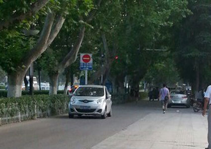 图:在洞山中路老龙眼北侧路口,一辆私家车从非机动车道上逆行,而车后就是一块禁行标志牌。