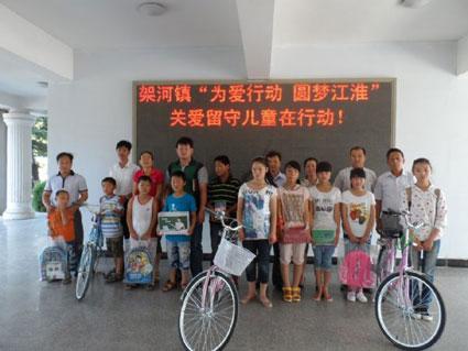 暑假刚刚开始不久,架河镇开展了“为爱行动 圆梦江淮”行动也如夏日的天气一样正火热地开展着。7月3日上午,架河镇11名爱心志愿者为11名留守儿童赠送了礼物,用爱心为他们圆了梦。其实留守儿童的梦想很简单,可能是想到龙湖公园去玩、想拥有一辆自行车、一部学习机、一个新书包或为爷爷买个保温杯……可这些对于他们来说是很难达成的,只能埋藏在他们幼小心灵深处。而此次圆梦活动,一部多功能学习,三辆自行车,三个书包、一个杯子、一个记事本和若干本书籍圆了11名儿童的梦想。