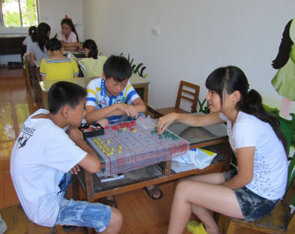 7月19日上午9点,在淮南市谢家集区驻平湖市新仓镇工作站内,一群在暑期赶到新仓镇与在那里打工的父母团聚的淮南孩子,在新成立的新居民子女快乐驿站里开心地下棋、看书。今年暑假,他们的课余生活因此而变得丰富多彩。