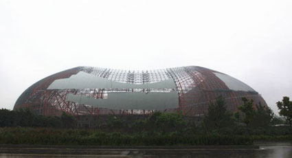 目前,主体结构已经封顶,钢结构吊装工作已完成,年底将全部完工