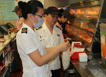 针对日前央视记者关于“检测发现肯德基崇文门店、真功夫崇文门店的冰块菌落数量高于国家标准,且高于马桶水数倍”的报道,7月22日,市食品监督所组织执法人员开展快餐店食用冰块抽检,分别对肯德基家乐福店、国庆路店、龙湖路店、蔡新路店及麦当劳加盟店安徽联升淮南龙湖中路店的自制食用冰块进行抽样检验。7月25日,检验结果表明,肯德基在淮4家门店及麦当劳加盟店龙湖中路店的食用冰块菌落总数均符合国家标准。