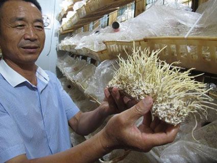 8月7日,记者来到高皇镇万岗村的安徽鑫农食用菌基地,这里已不再是以前种蘑菇的草棚,而发展成智能化的恒温室。由彩钢板和保温材料建成的恒温室,可根据食用菌的生长条件智能调节温度,不同品种的食用菌可给予相应适宜的温度。从酷暑的室外乍一进入恒温室,顿感凉意阵阵,十分舒服,由于“虫草”栽培需要,恒温室温度还不到20℃,在这里记者看到,一排排分为好几层的培育架上,摆放着一个个方盘型的培养基,外面覆以密封的塑料袋,培养基上已长出金黄色鲜嫩的“虫草”。