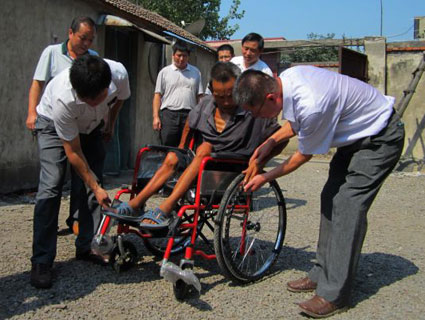 当天上午,淮南市残联、潘集区残联走访慰问了潘集区三位农村肢残贫困人士。李占好是第一位,他从小由于小儿麻痹症不能行走,多年来由于贫困而坐不上轮椅,想出趟门都不容易。在李占好家的院子里,坐在残联赠送给他的轮椅上,拿着《安徽残疾人保障条例社区康复知识》和淮南残疾人民生工程宣传材料的李占好特别兴奋,他对记者说,等过两天天凉快了,他就可以出门转转了。告别了李占好后,大家又来到泥河镇陶王村,这里的五保老人刘佩春2006年干活不慎被砸中双腿而落下了残疾,现在他只能靠着一个自制的工具勉强行走,生活十分不便,残联给他送来了轮椅及慰问金并嘱咐他好好康复。