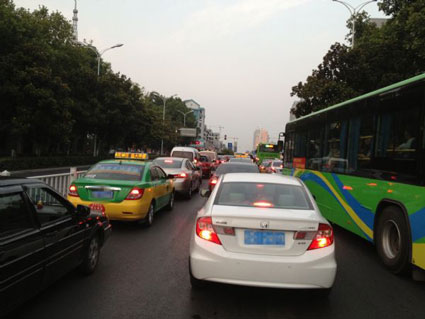 正说着,另一辆9路车已经开过来,师傅笑着说:“看看,我又晚点了。”另一辆9路车的师傅打开窗户说,“你怎么还在这里,要迟到了。”师傅回答:“我也没办法,你有本事就飞过去。”师傅指指前方密密麻麻的车辆打趣道。“我们天天在路上跑得都已经习惯堵车了,不过看着很多车辆不遵守交通规则,只要有一点空就挤,这样的司机很没素质,其实车辆多是一方面原因,还有很多司机不按规则行车才是最主要的。”师傅告诉记者。