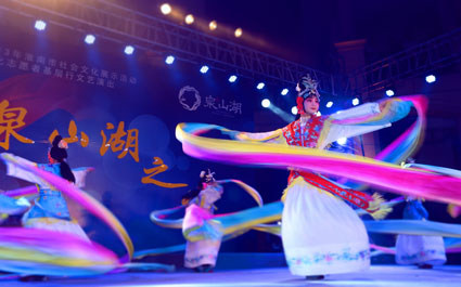 经过了一个夏天的期待,“大地欢歌”文化惠民演出再次开演。20日晚,泉山湖品鉴中心广场上人山人海,“大地欢歌”2013年淮南市社会文化展示活动“泉山湖之约”大型文艺晚会隆重上演。“泉山湖之约”大型文艺晚会是2013年淮南市社会文化展示活动“大地欢歌”推出的一项大型文化惠民演出项目。晚会由淮南市文广新局、安徽泉山湖置业有限公司联合举办,旨在搭建百姓文化舞台,展现草根文化风采、丰富群众文化生活,展现淮南人民热爱生活、追求梦想的精神风貌。