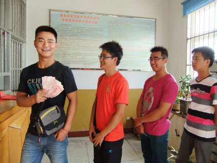 今年,朱泽帮以543分考上了广东外语外贸大学,在拿到入学通知书后,他一度为筹集学费犯了愁。由于家境贫困,朱泽帮甚至做出了放弃上学,外出打工的决定。为了能让贫困学子顺利入学,实现大学梦,三和乡政府给予今年该乡考上本科以上的37名贫困学生,每人1000元的现金资助,解决他们的燃眉之急。图为:贫困的准大学生们领到了助学金。