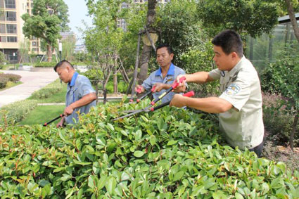 图:园林专业技术人员向物业管理人员讲解如何进行绿篱、树木规范修剪的程序和注意的事项。