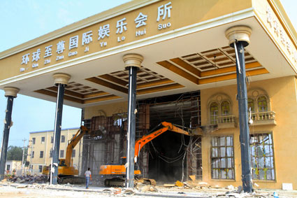 震撼人心的一幕,定格于11时12分:只看见在两台大型挖掘机强力拉动下,巨大的门厅轰然倒塌,带有“环球至尊国际娱乐会所”大字的巨幅招牌倒成一片。
