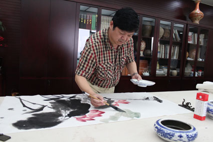 在现场,记者看到,一张大桌上,书画家们一齐挥毫泼墨,场面不仅充满了书香气息,更蕴含着其乐融融的中秋氛围!深圳南方画院院长、深圳海峡两岸联谊会特聘画家范新河在短时间内完成画作《墨荷》,荷塘里绿叶碧波荡漾,荷花婀娜妖娆,引得连连称赞。