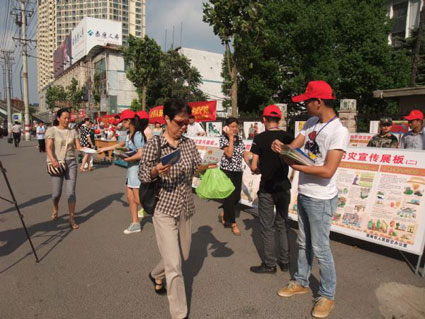 当天上午,记者早早就来到了淮南田家庵区政府的大门前,只见淮南市人防办和田家庵区人防办的工作人员正在布置展牌,有几名学生模样的青年志愿者在街头向路过的行人散发《居民防空防灾手册》、《人们防空知识》等宣传册。