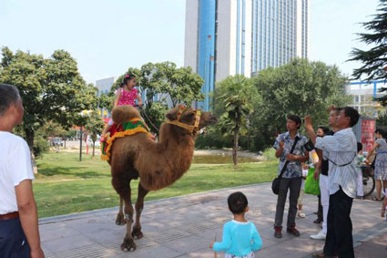 图为城里的小朋友争相骑上难得一见的骆驼。