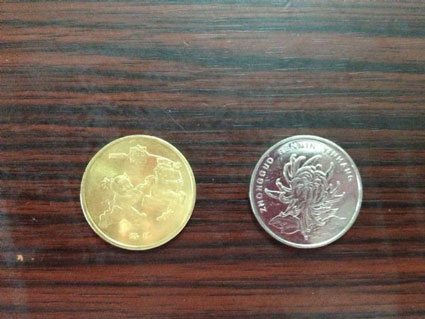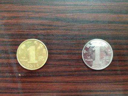 这位经营社区卫生服务站的市民告诉记者,硬币应该是前几天晚上一个孩子买药时给他的,“平时来买东西的都是附近的居民,我基本都不怎么看递过来的钱,更何况是一元硬币。而且傍晚天色比较暗,所以更没在意。”记者看到,这枚硬币和我们平时使用的普通一元硬币是同样大小,不过颜色不是银色,却是金黄色。从正面来看和普通硬币没什么区别,上面也写着“中国人民银行”、“1元”、以及“2013”的字样,可是背面不是正常的一元硬币的图案,而是两个孩子拿着蛇嬉戏玩耍的图样,下面写着“癸已”的字样。如果在昏暗的灯光下,乍一看还的确看不出两枚硬币的不同。