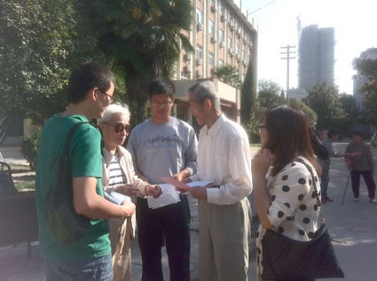 10月13日重阳节上午,在安理大生活区广场,朝阳街道理工大社区居委会在此设立政策宣传咨询点,向过路群众宣讲有关老年人的法律法规政策。
