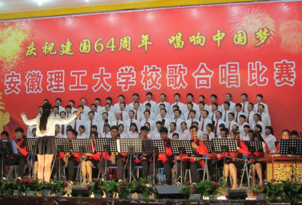 “一条大河波浪宽,风吹稻花香两岸……”10月19日下午,悠扬的歌声在安理大北校区大学生活动中心回荡,安理大庆祝建国64周年,唱响中国梦校歌合唱比赛现场一片热烈的气氛。一首首耳熟能详的歌曲表达了大学师生热爱祖国、热爱生活、立志报国的思想感情。