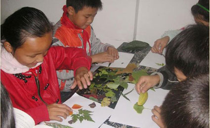 图为:淮南师范学院大学生利用学业特长指导方楼小学的小学生们用树叶作画,培养孩子们探究大自然的兴趣(淮南师范学院供图)。