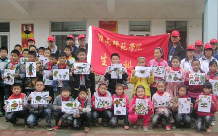 11月5日,淮南师范学院生命科学系的青年志愿者联系到本报记者,向记者展示了他们携手方楼小学,启动“秋的箴言”活动照片,记者从这些照片上看到,大学生们结合自己的特长,创新活动形式,现场教小学生们用收集到的各色树叶,制作丰富多彩的粘贴画。据大学生们向记者介绍,他们除了教小学生们用树叶作画外,还利用多媒体设备给小学生讲解丰富有趣的科普知识,与该校的留守儿童一道谈心、做游戏,今后,这类活动他们还将继续开展。