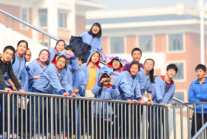 11月21日,淮南二中校运动会现场,一群身穿统一动物模样服装的同学正在场外呐喊助威。高一(1)班的一名同学告诉记者,这是他们统一购买的班服,也是他们的“闺蜜服”。当天来为运动员们当拉拉队,当然要穿上这身拉风的班服。