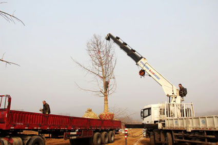 为了创建国家森林城市,打造宜居宜业宜游的生态强市,创新淮南园林绿化新特色,我市舜耕山风景区主入口的银杏林正在紧张的施工中。12月4日,记者来到了舜耕山风景区主入口处银杏林的种植现场。记者看到,负责工程施工的华艺生态园林股份有限公司的园林人员正在使用起重机从货车上卸载刚刚运抵的银杏树。银杏林的场地已全部被平整了出来,而且还用白线画出了树木种植的间距。大型挖掘机正在按照白线所画的间距挖掘着树坑,10多名园林工人正在对准备种植的银杏树进行修剪。