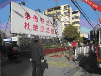 为进一步改善城市面貌,田区城管对田区大型户外广告进行查处拆除,尤其针对泉山南路淮化生活区两处“高炮”广告,他们积极与淮化集团进行交涉、沟通,充分传达、解释了市区两级的工作要求和精神,同时,着力完善广告拆除相关法律手续,最终,淮化集团决定自行拆除户外广告。