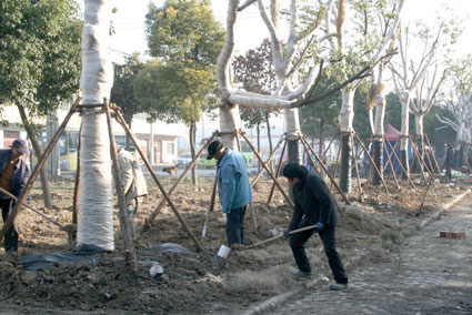 图:园林工人正在给移植不久的香樟进行冬季养护。