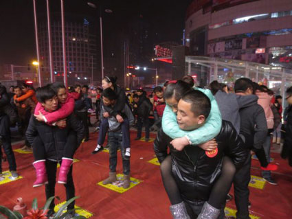 虽然室外温度接近冰点,但比赛现场却是火辣辣的。随着裁判长一声号令,只见女同胞们或跳、或蹦、或窜,一点也不顾及淑女的形象,飞身骑到了男友的身上。而现场拥抱的形式也可谓是五花八门,有背抱、熊抱、肩扛、公主抱、单脚换脚抱等,更有“女汉子”背着男友参加比赛。除了年轻的情侣外,还有不少中年夫妇来凑个热闹,他们表示参赛只是意思一下,通过比赛增进夫妻感情才是主要目的。比赛的规则也很简单,只要女同胞的双脚不接触到地面,不论用什么拥抱姿势,坚持得时间越久便能获胜。时间一分一秒地过去,赛场外加油声、鼓励声此起彼伏,赛场内选手们个个不服输。比赛从18时20分开始直至22时结束,最终一对情侣以3小时10分钟的时长赢得冠军,当然冠军的奖励也相当丰厚,一对价值万元的钻石对戒。图为赛场上的情侣们相互依偎,见证着自己的爱情。
