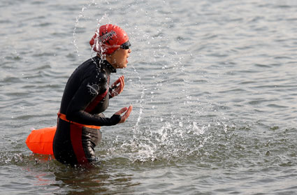 图一、冬泳爱好者正在泉山湖里游泳。图二、一位冬泳爱好者正在做热身。