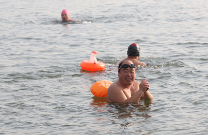 12月28日气温骤降,记者在泉山湖附近的池塘里看到,水面结冰达到1寸多厚,丢块砖头都砸不动。而泉山湖水面由于面积大,还没有完全上冻,一位冬泳爱好者测得水温大约不足5℃。但低温丝毫没有打击到热爱冬泳的市民,他们不仅水中畅游,寒中击浪,还露出乐观的笑容。