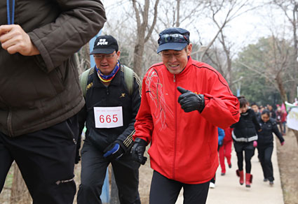 今年已经88岁高龄的马拉松老将张亮友也来到现场,并和83岁的老伴尚殿娥一起参加了此次登山活动。张亮友告诉记者,他和老伴经常登山,每天坚持跑步运动,这一次花了11分钟就登上了山顶,心里特别开心。