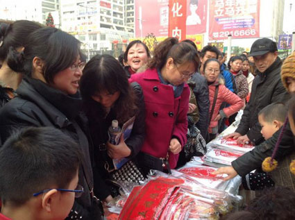 作为世界非物质文化传承项目的剪纸,在淮南有着深厚的群众基础,其中代表人物张传锦的剪纸更是独树一帜,她的剪纸作品不仅在全国美术工艺品大展中屡屡获奖,部分作为具有地方特色旅游商品还被市旅游局送上了飞机,畅销全国。当日下午,在市商贸文化广场前举办的迎新春送春联、欢欢喜喜过大年活动中,她现场指导小学生学剪纸,送春联,深受大家喜爱。