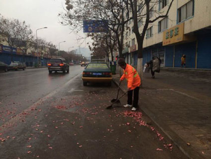 图:清晨的学院南路上环卫工人正在清扫鞭炮的纸屑。